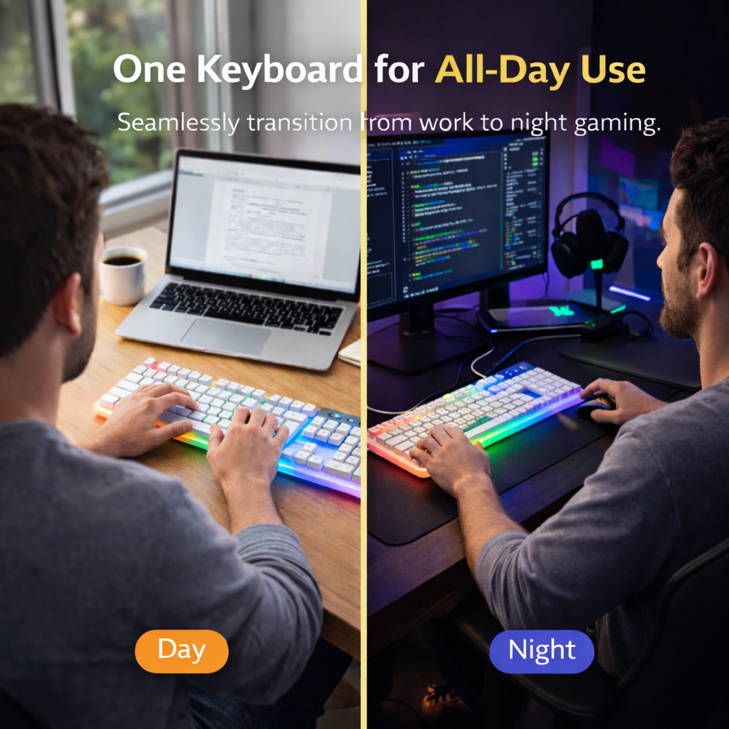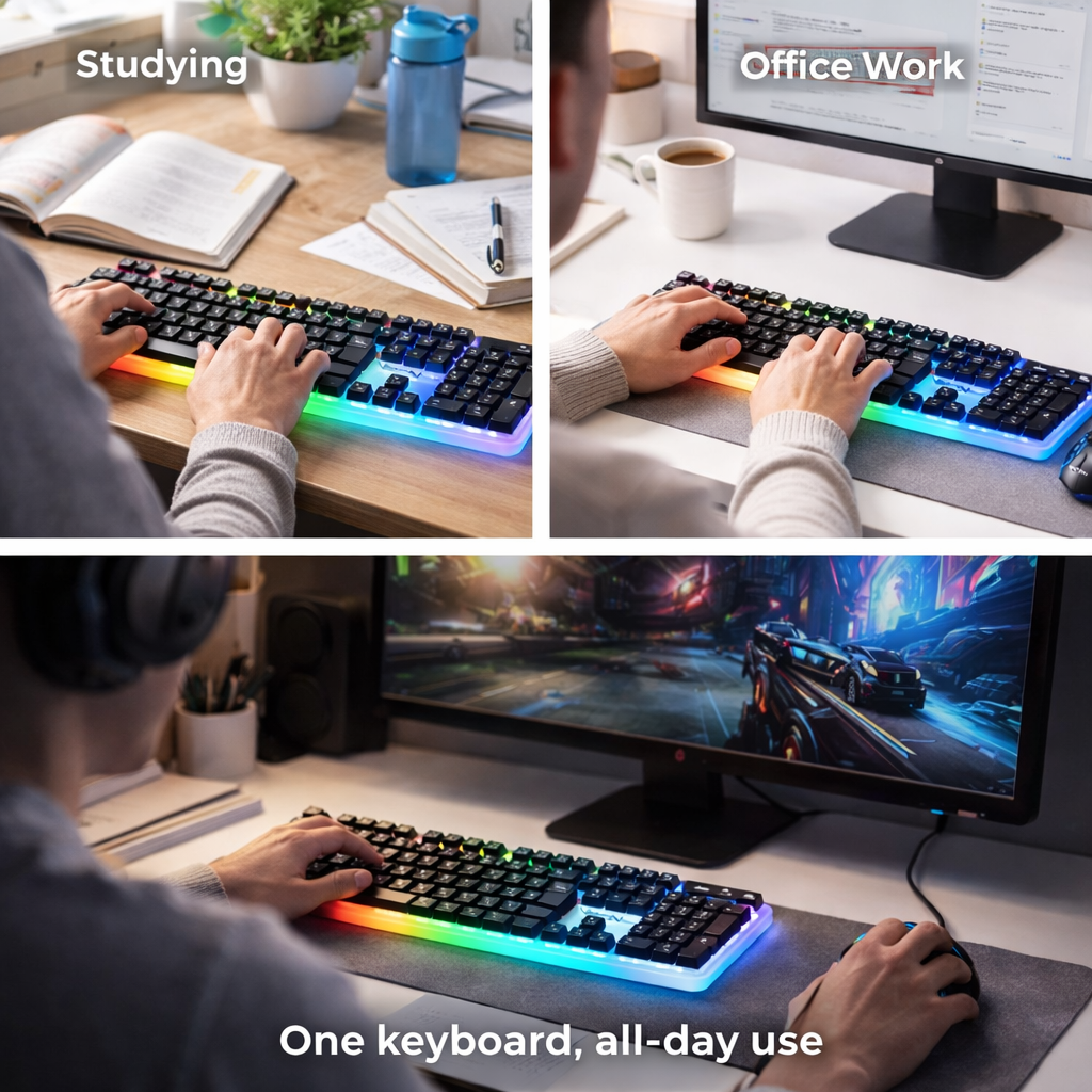 লো-নয়েজ কী-প্রেসে আরামদায়ক টাইপিং আর চোখে চাপ না দেওয়া RGB লাইটে সুন্দর ডেস্ক সেটআপ—অফিস, পড়াশোনা ও হোম ইউজের জন্য পারফেক্ট।