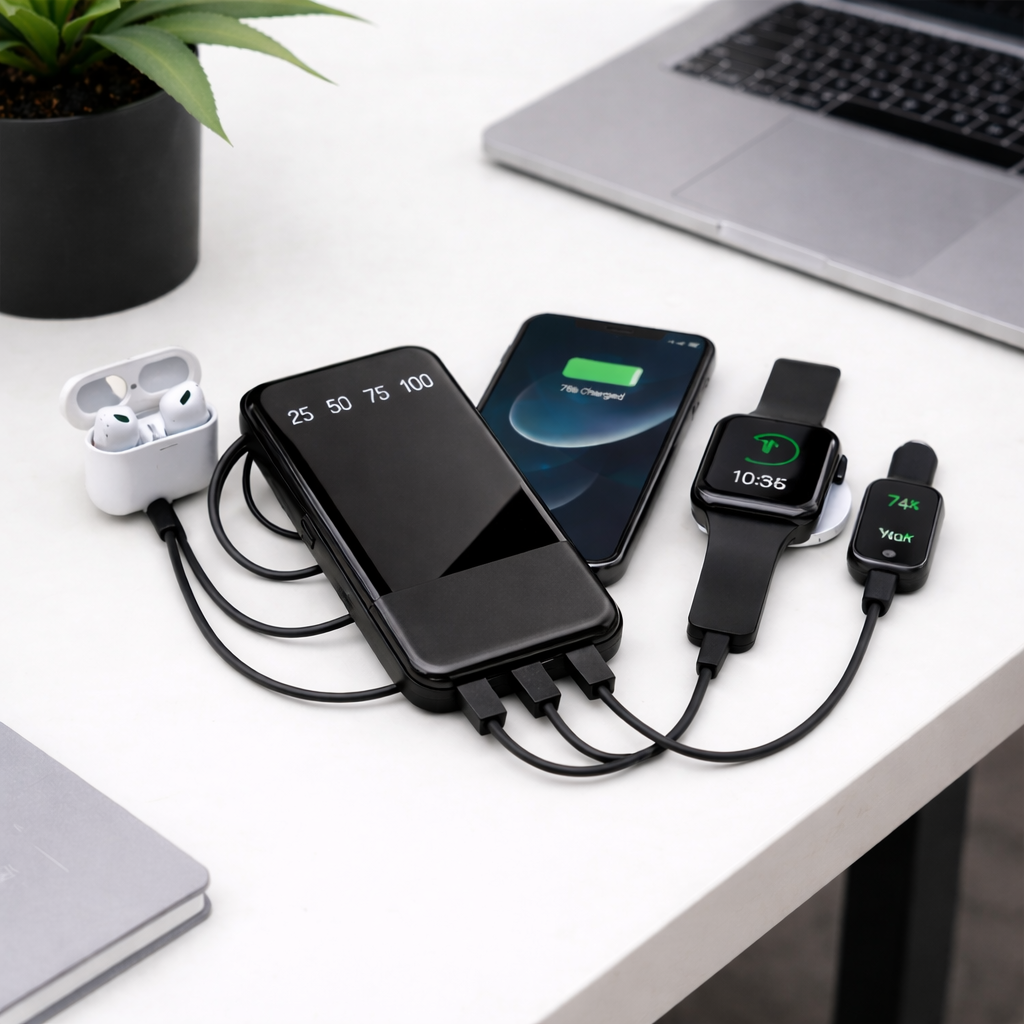 👉 না। এতে built-in charging cables রয়েছে, তাই আলাদা কেবল ছাড়াই একাধিক ডিভাইস চার্জ করা যায়।