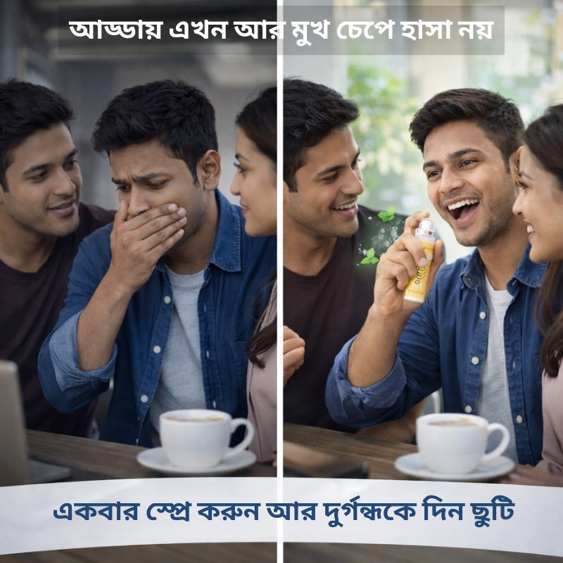 এই প্রিমিয়াম ওরাল স্প্রে আপনাকে দেয় ইনস্ট্যান্ট ফ্রেশ ব্রেথ ও হ্যান্ডস-ফ্রি আত্মবিশ্বাস। অফিস, ক্লাস, ডেট, ভিডিও কল বা ট্রাভেল—সব পরিস্থিতিতে একটাই স্মার্ট সল্যুশন।