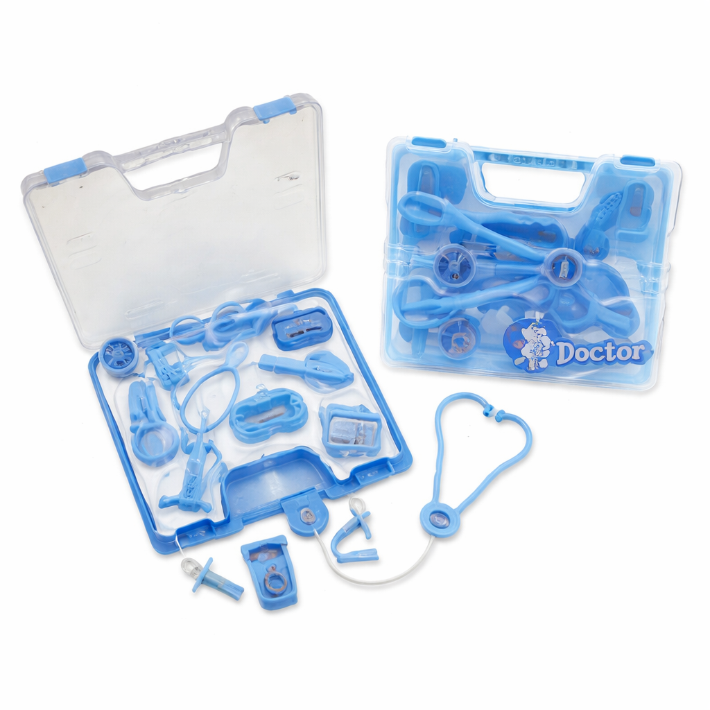 👉 এই সেটে সাধারণত stethoscope, syringe, thermometer, medicine bottle, tray সহ প্রয়োজনীয় ডাক্তারের সরঞ্জাম থাকে।